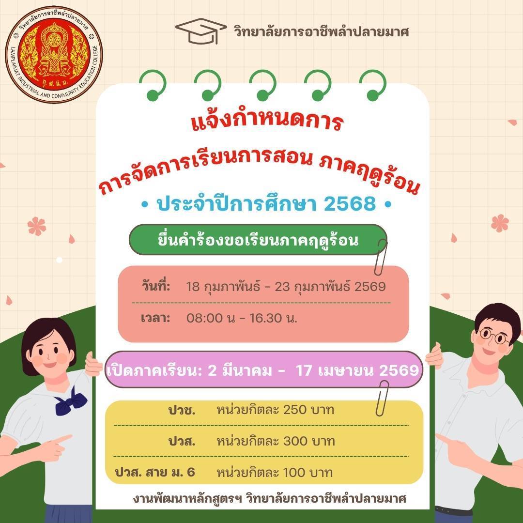 ข่าวประชาสัมพันธ์ข่าวสำหรับนักเรียน การเปิดการเรียน-การสอนภาคฤดูร้อน ประจำปีการศึกษา 2568 20 กุมภาพันธ์ 2026 lpmic