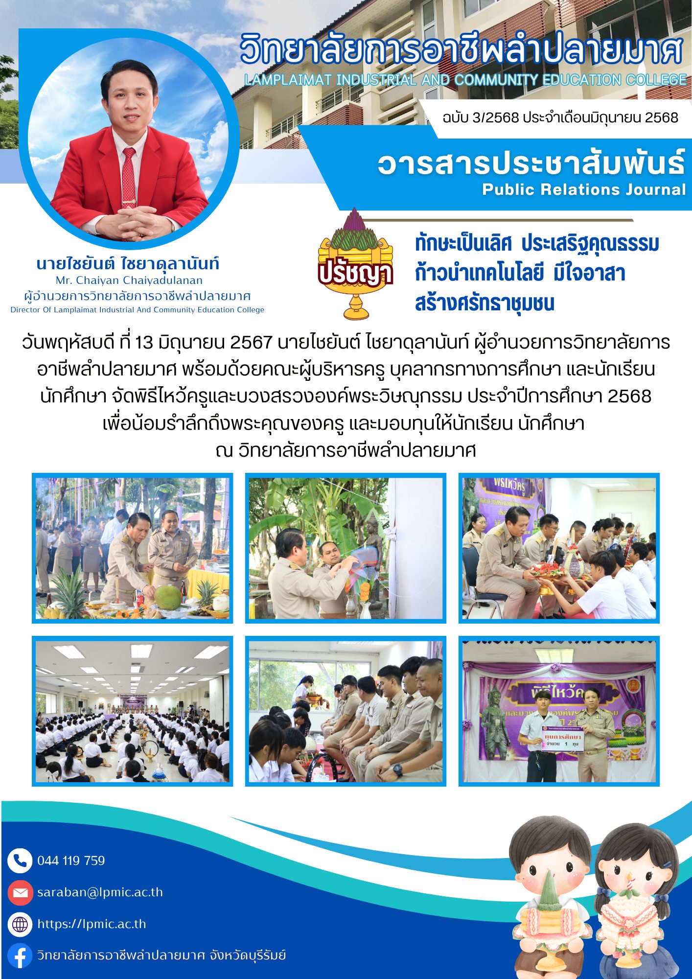 เมื่อวันพฤหัสบดี ที่ 19 มิถุนายน 2568 นายไชยันต์ ไชยาดุลานันท์ ผู้อำนวยการวิทยาลัยการอาชีพลำปลายมาศ พร้อมด้วยคณะผู้บริหารครู บุคลากรทางการศึกษา และนักเรียน นักศึกษา จัดพิธีไหว้ครูและบวงสรวงองค์พระวิษณุกรรม ประจำปีการศึกษา 2568 เพื่อน้อมรำลึกถึงพระคุณของครู และมอบทุนให้นักเรียน นักศึกษาณ วิทยาลัยการอาชีพลำปลายมาศ