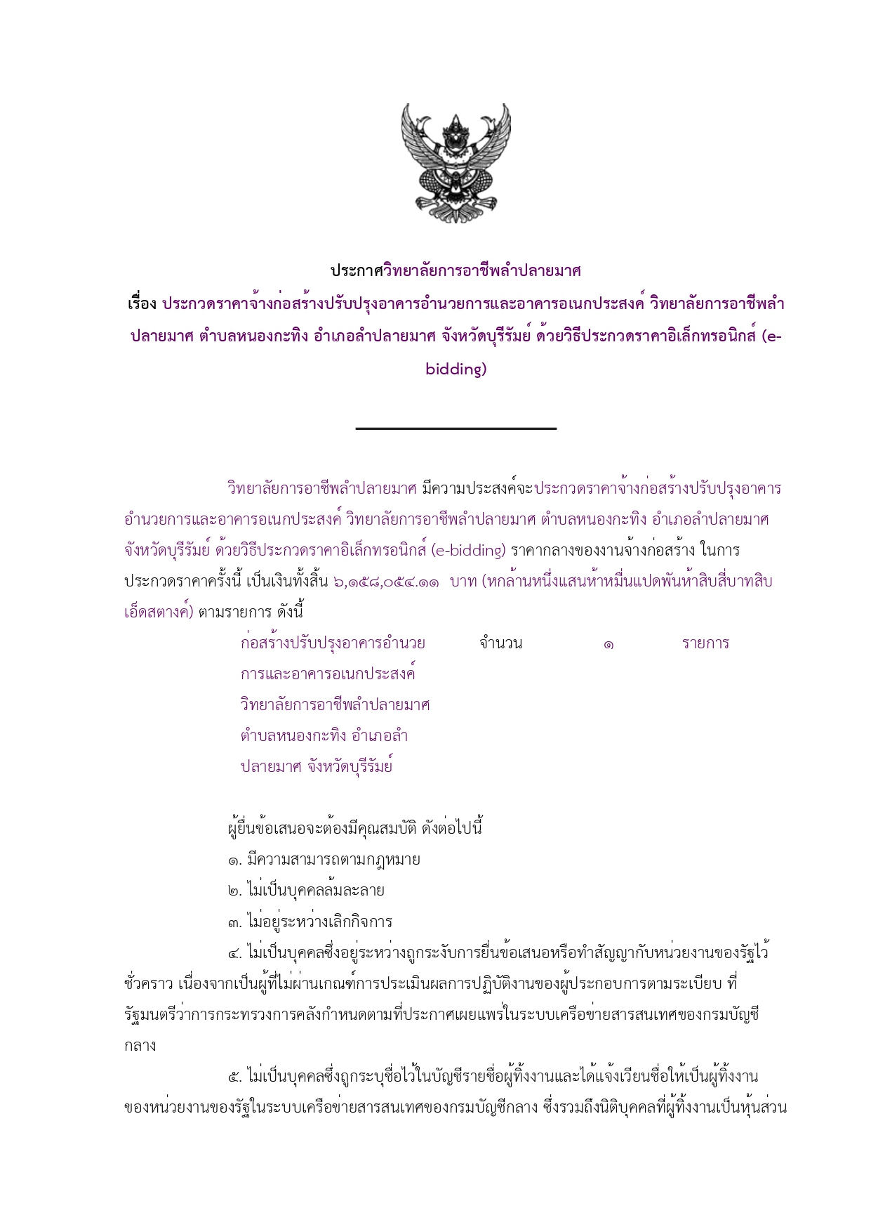 ประกวดราคาจ้างก่อสร้างปรับปรุงอาคารอำนวยการและอาคารอเนกประสงค์ วิทยาลัยการอาชีพลำปลายมาศ