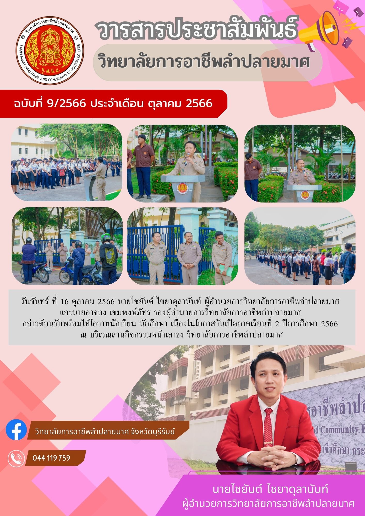 วันจันทร์ ที่ 16 ตุลาคม 2566 นายไชยันต์ ไชยาดุลานันท์ ผู้อำนวยการวิทยาลัยการอาชีพลำปลายมาศ และนายอาจอง เขมพงษ์ภัทร รองผู้อำนวยการวิทยาลัยการอาชีพลำปลายมาศ กล่าวต้อนรับพร้อมให้โอวาทนักเรียน นักศึกษา เนื่องในโอกาสวันเปิดภาคเรียนที่ 2 ปีการศึกษา 2566