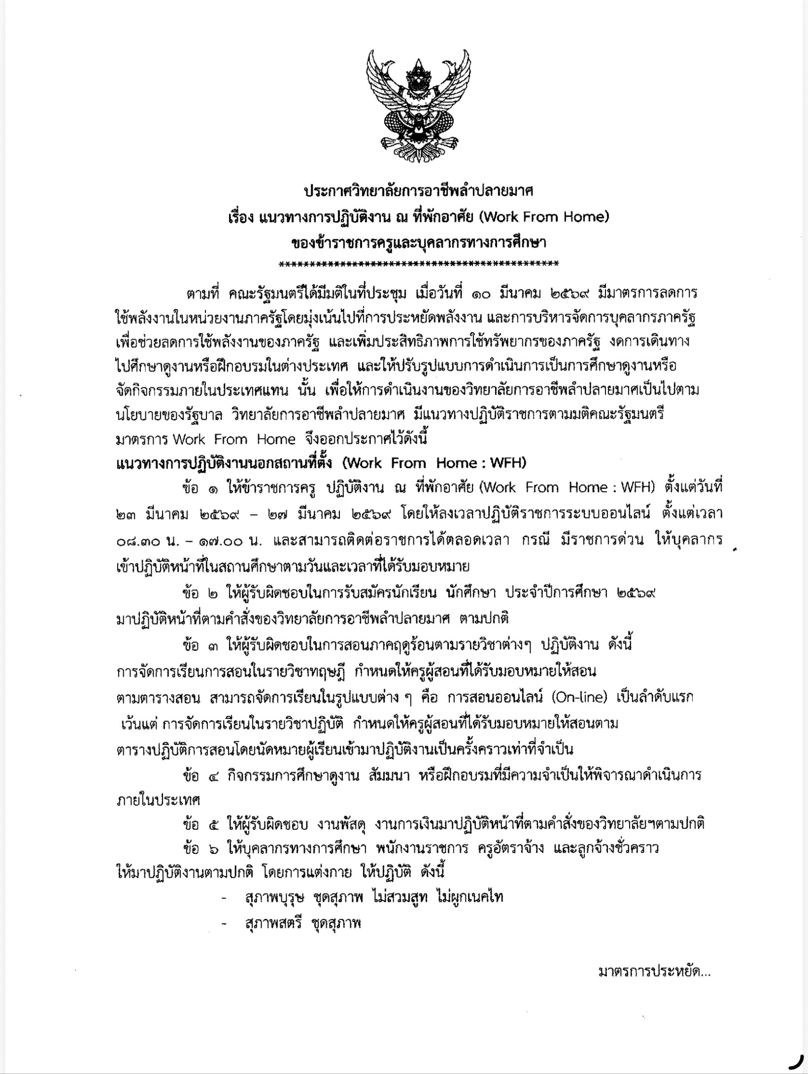 ประกาศวิทยาลัยการอาชีพลำปลายมาศ แนวทางการปฏิบัติงาน ณ ที่พักอาศัย(Work From Home ) ของข้าราชการครูและบุคลากรทางการศึกษา