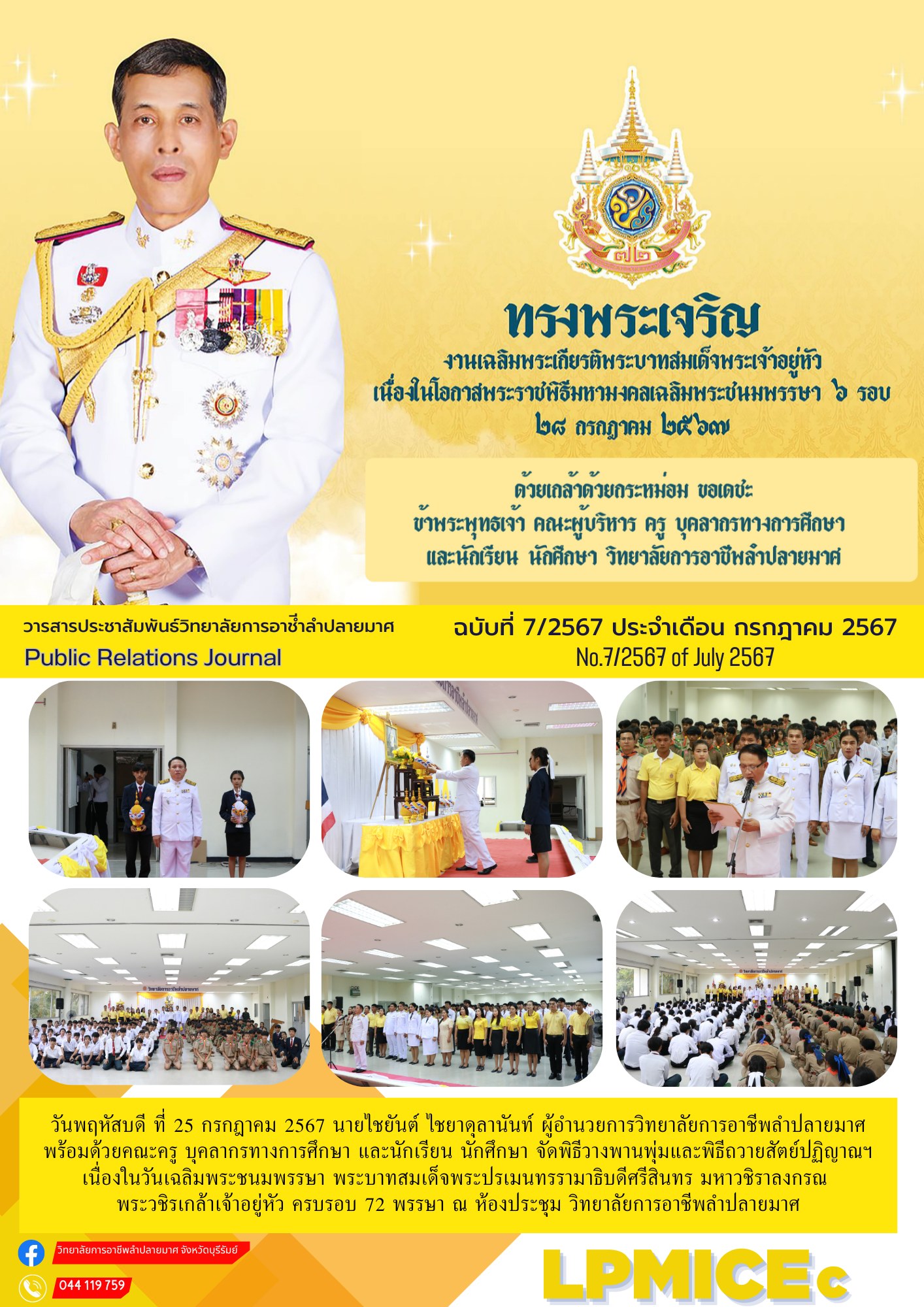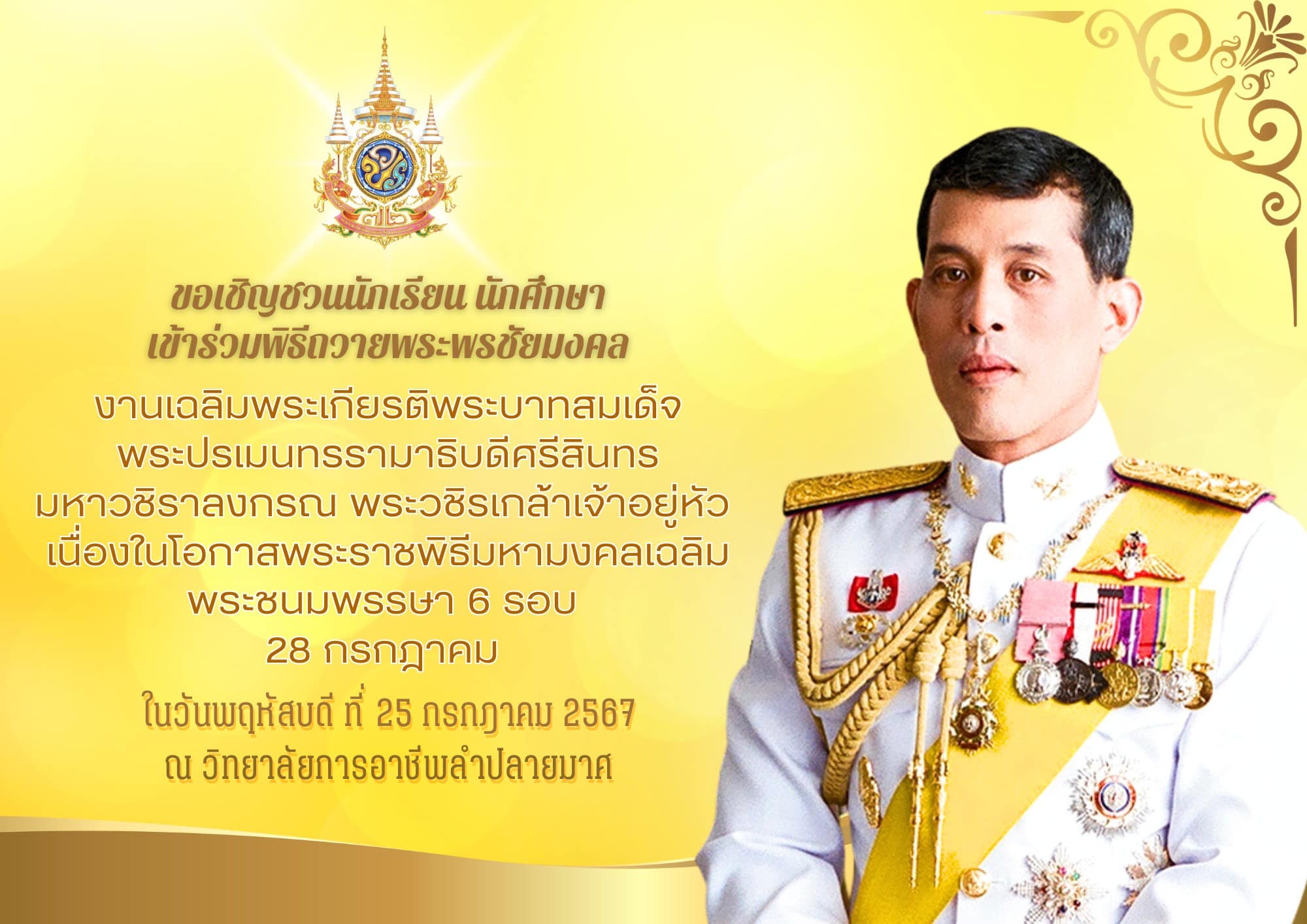 เมื่อวันพฤหัสบดี ที่ 25 กรกฎาคม 2567 นายไชยันต์ ไชยาดุลานันท์ ผู้อำนวยการวิทยาลัยการอาชีพลำปลายมาศ  พร้อมด้วยคณะครู บุคลากรทางการศึกษา และนักเรียน นักศึกษา จัดพิธีวางพานพุ่มและพิธีถวายสัตย์ปฏิญาณฯ  เนื่องในวันเฉลิมพระชนมพรรษา พระบาทสมเด็จพระปรเมนทรรามาธิบดีศรีสินทร มหาวชิราลงกรณพระวชิรเกล้าเจ้าอยู่หัว ครบรอบ 72 พรรษา ณ ห้องประชุม วิทยาลัยการอาชีพลำปลายมาศ